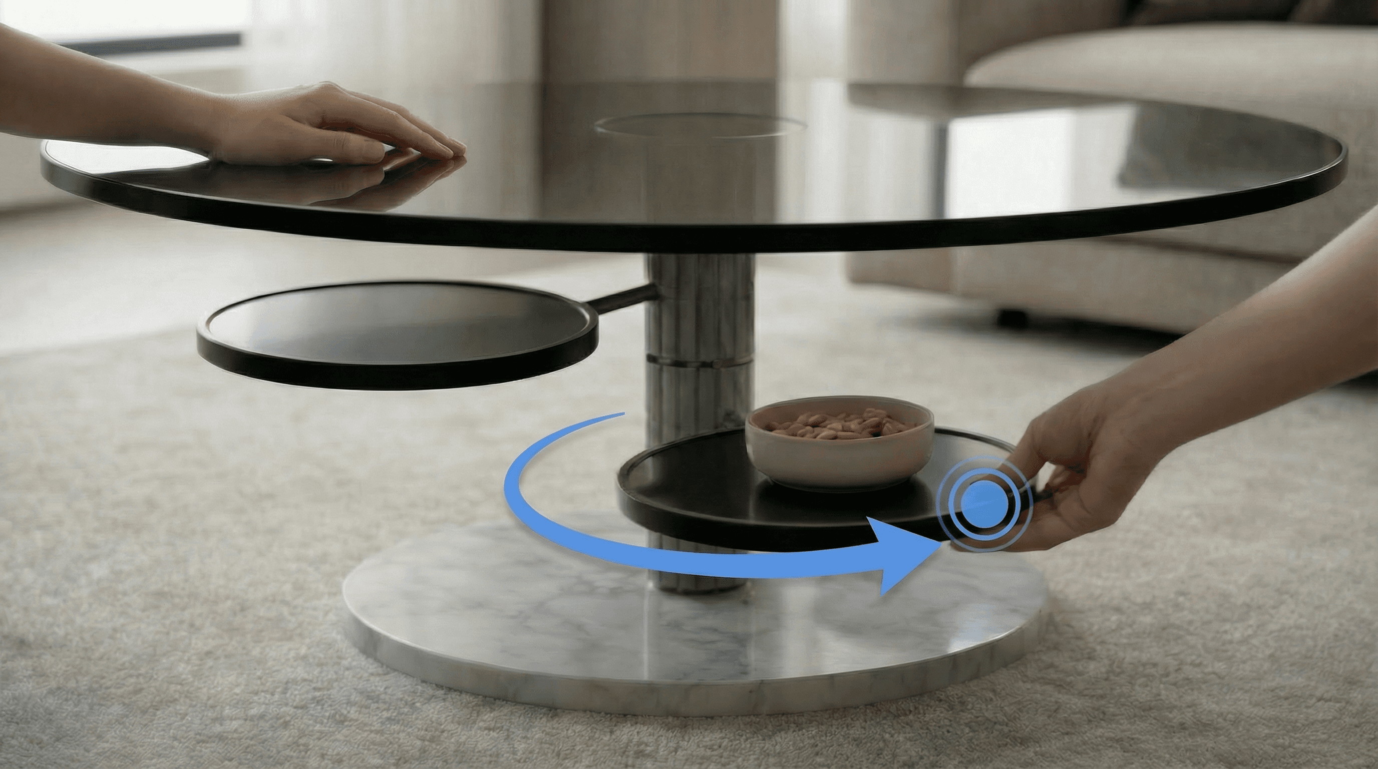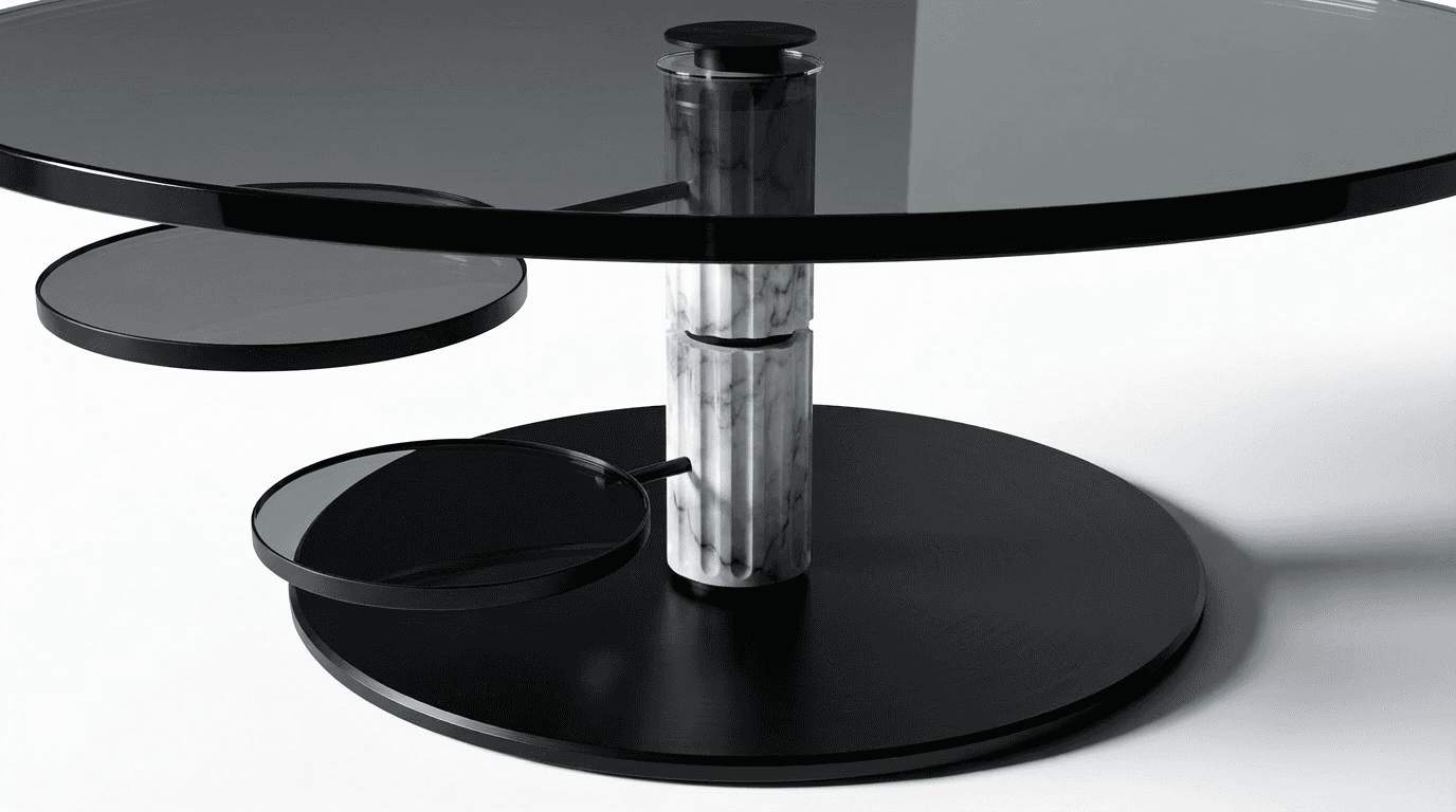 Dispositif narratif appliqué à ENTRAXE, table basse à plateaux pivotants, où l’interaction devient langage visuel. Le mouvement, la lumière et la matière traduisent l’expérience dans un rituel stable.